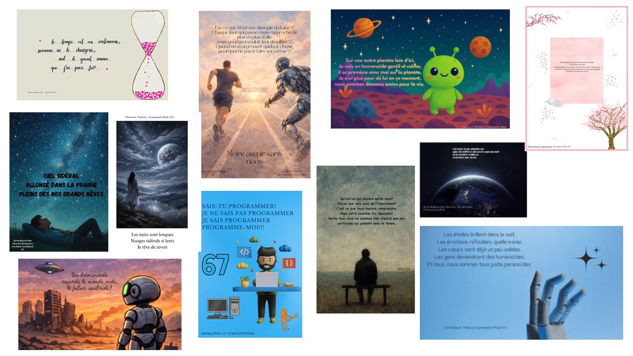 Do soutěže bylo celkem zasláno 117 výtvorů. Odborná porota Francouzského institutu nakonec vybrala tři vítězné práce – mezi nimi i společné dílo našich studentek Ash Pfeiler a Anny Kuchtíkové ze 6.F, kterým tímto srdečně gratulujeme.