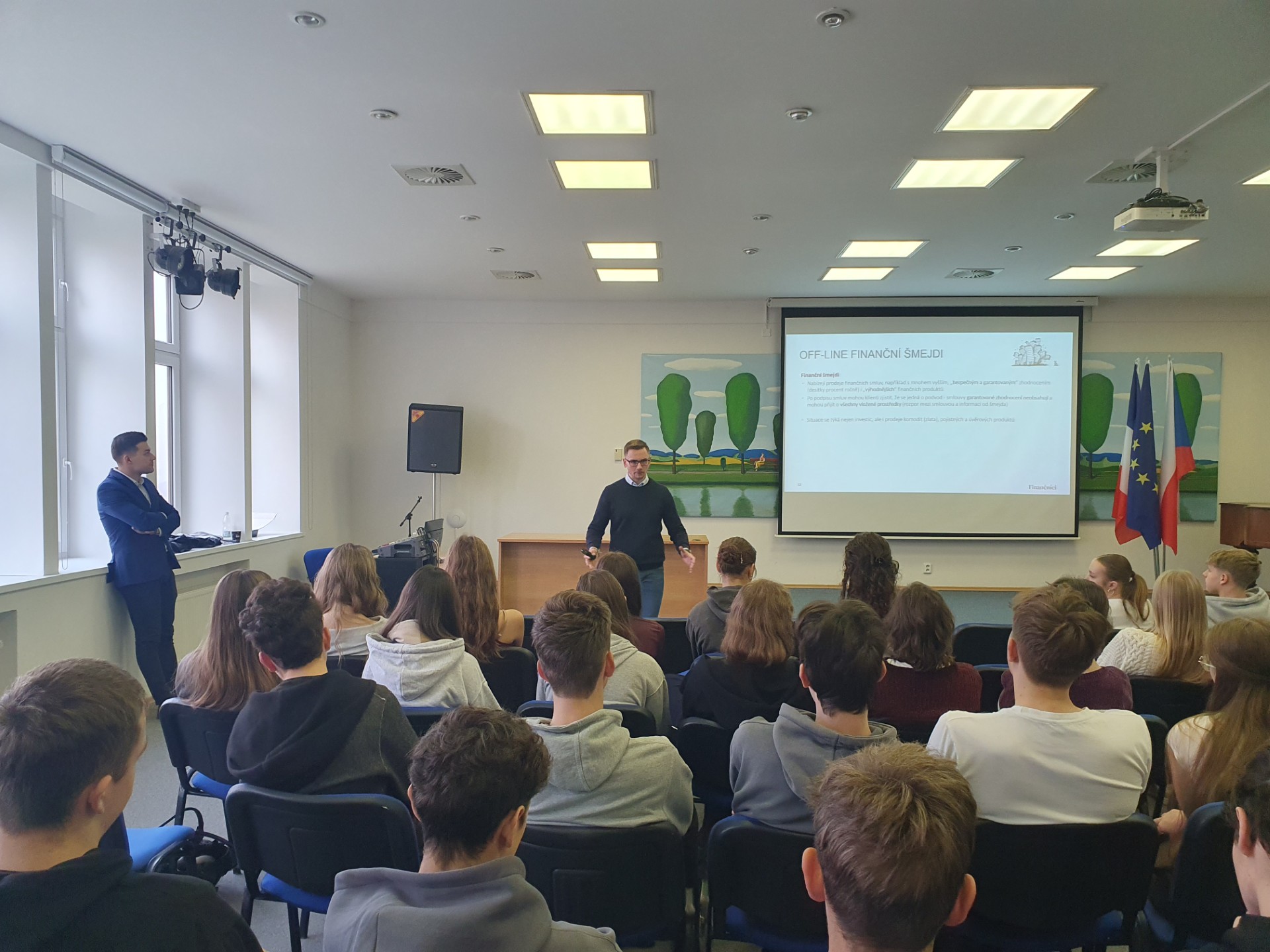 Oba lektoři žákům srozumitelně představili bezpečný a zodpovědný pohyb ve světě peněz. Zaměřili se především na praktiky takzvaných „šmejdů“ – tedy podvodníků, kteří se snaží vylákat z lidí peníze pomocí nepoctivých nabídek či agresivního prodeje. Upozornili, jak takové triky rozpoznat a jak se jim účinně bránit. Věnovali se také problematice exekucí, zejména chování se jedince tak, aby se do podobné situace vůbec nedostal.