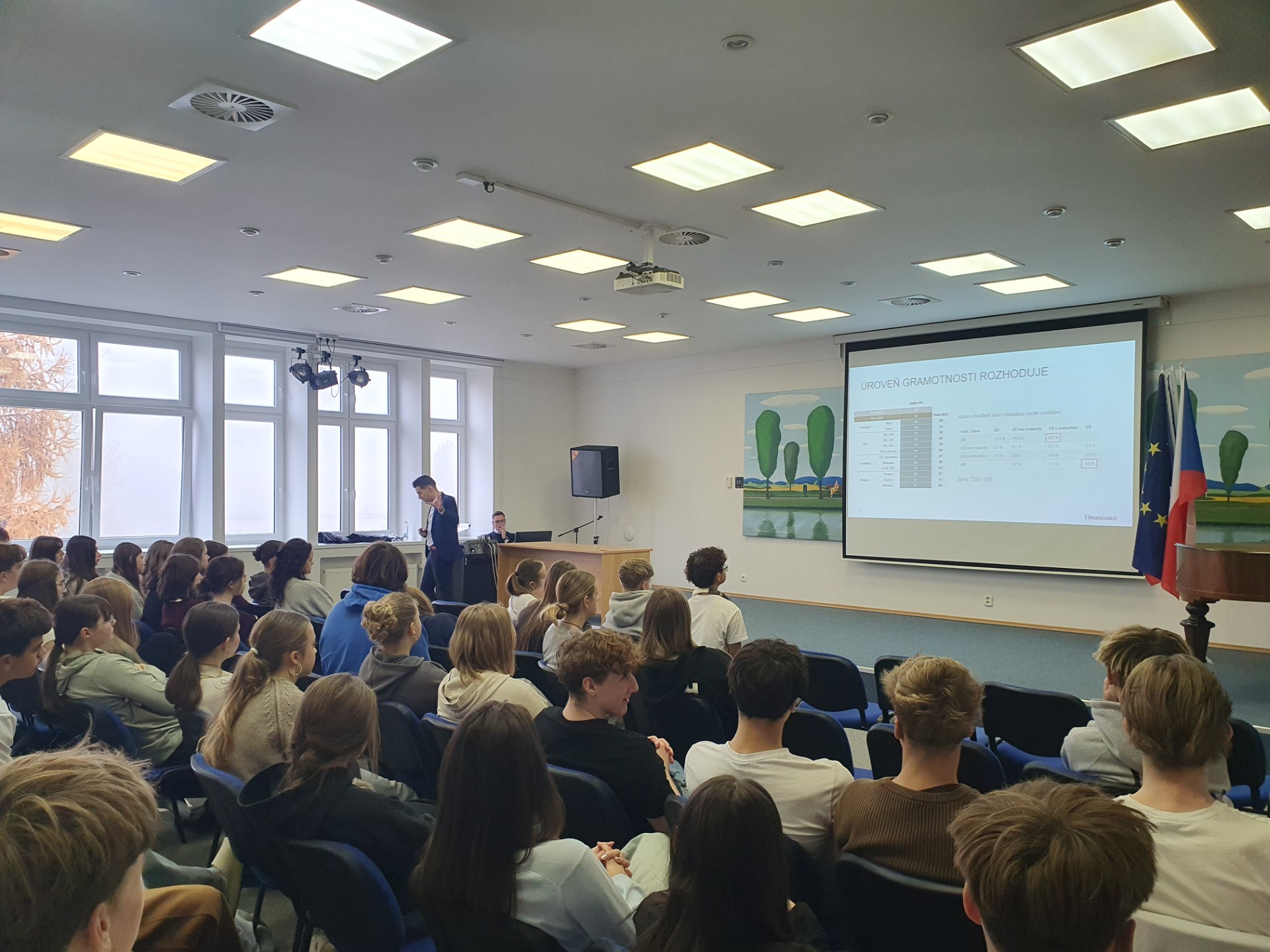 Beseda o finanční gramotnosti v aule školy